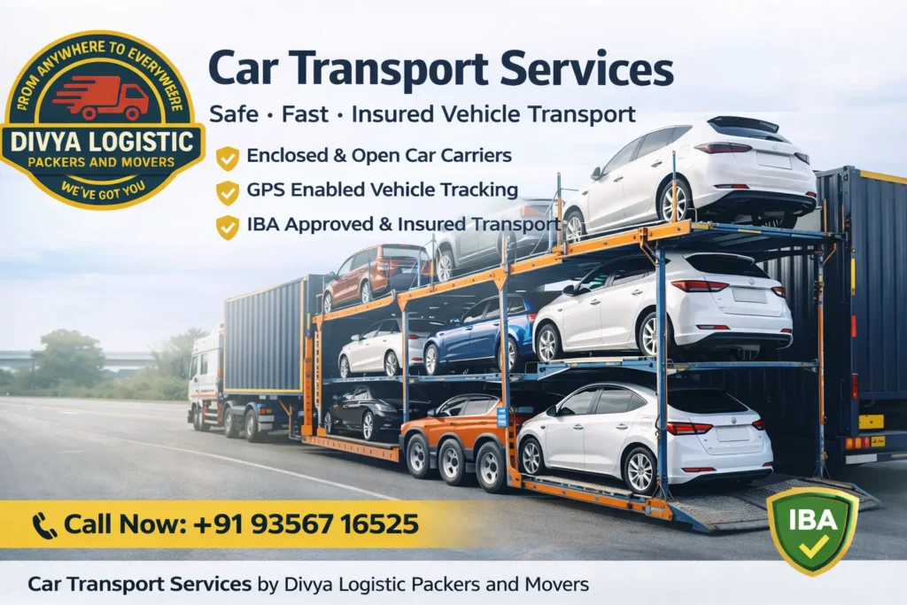 Divya Logistic Packers and Movers offers secure, insured, and GPS-enabled car shifting services for local, intercity, and interstate relocation across India.Β With ISO 9001:2015 certification, IBA approval, and a professional logistics team, we ensure damage-free car transportation at the best price.